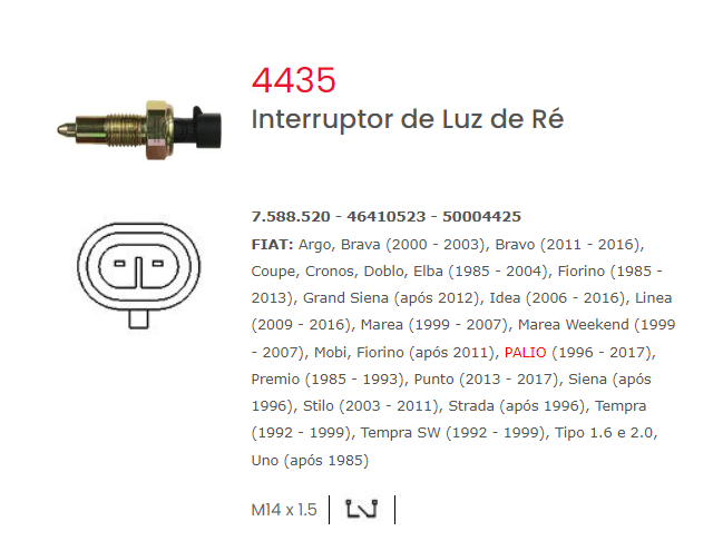 FIAT: Argo, Brava (2000 – 2003), Bravo (2011 – 2016), Coupe, Cronos, Doblo, Elba (1985 – 2004), Fiorino (1985 – 2013), Grand Siena (após 2012), Idea (2006 – 2016), Linea (2009 – 2016)...